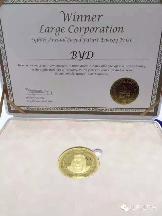 (2016年1月18日,阿布扎比),全球瞩目的扎耶德未来能源奖在阿联酋阿布扎比揭晓,全球新能源领军企业比亚迪击败其他两家世界500强企业,历史性的摘得该奖桂冠,成为中国首家获得大型企业类奖项的企业。比亚迪也成为全球唯一一家包揽该奖项大型企业类奖和个人终身成就奖的企业。