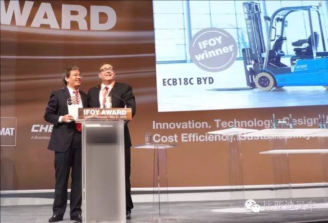 IFOY (International Forklift-Truckof the Year) 国际叉车年度大奖的目标是鉴定和认可全球年度最佳的物料运搬设备以及内部物流解决方案,另外也致力于评估突出的内部物流技术、战略目标、以及刺激行业创新。该奖项由全球最具权威性的经济、科学和技术媒体评审团评出,被业界称为全球叉车行业风向标。来自全球多个国家共计25个评审团成员对我司叉车进行了长达1周的深度测试。在对驾驶安全性、操控舒适性、动力表现、工作效率、制动性能、转向性能、整车可靠性以及综合能耗等方面进行全面评测后,对我司叉车评价道:“比亚迪电动叉车并不需要担心被拿来跟欧洲竞争对手作比较。相反,凭借其经济、高效、环保、领先的综合技术,比亚迪为他们的客户提供了真正的高附加值叉车产品。”